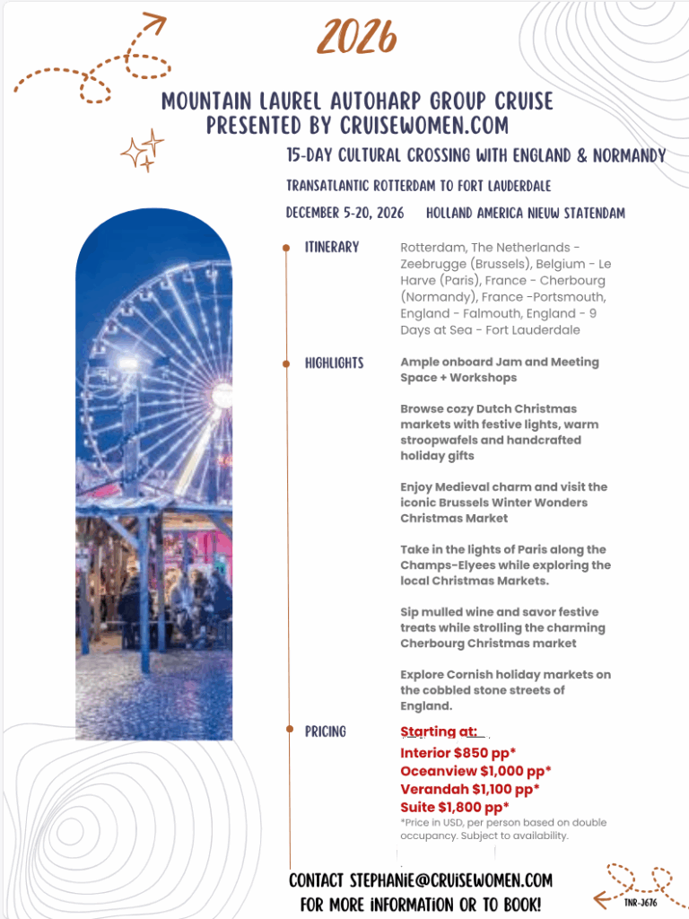The 2026 MLAG Cruise will be a 15 Day Cultural Crossing with stops in England, France and Normandy. We’ll sail on Holland America’s Nieuw Statendam Dec 5-20, 2026. Lots of meeting space, jam sessions and workshops for ’round the clock music-making.  Please reach out to Stephanie@Cruisewomen.com for more information or to book.